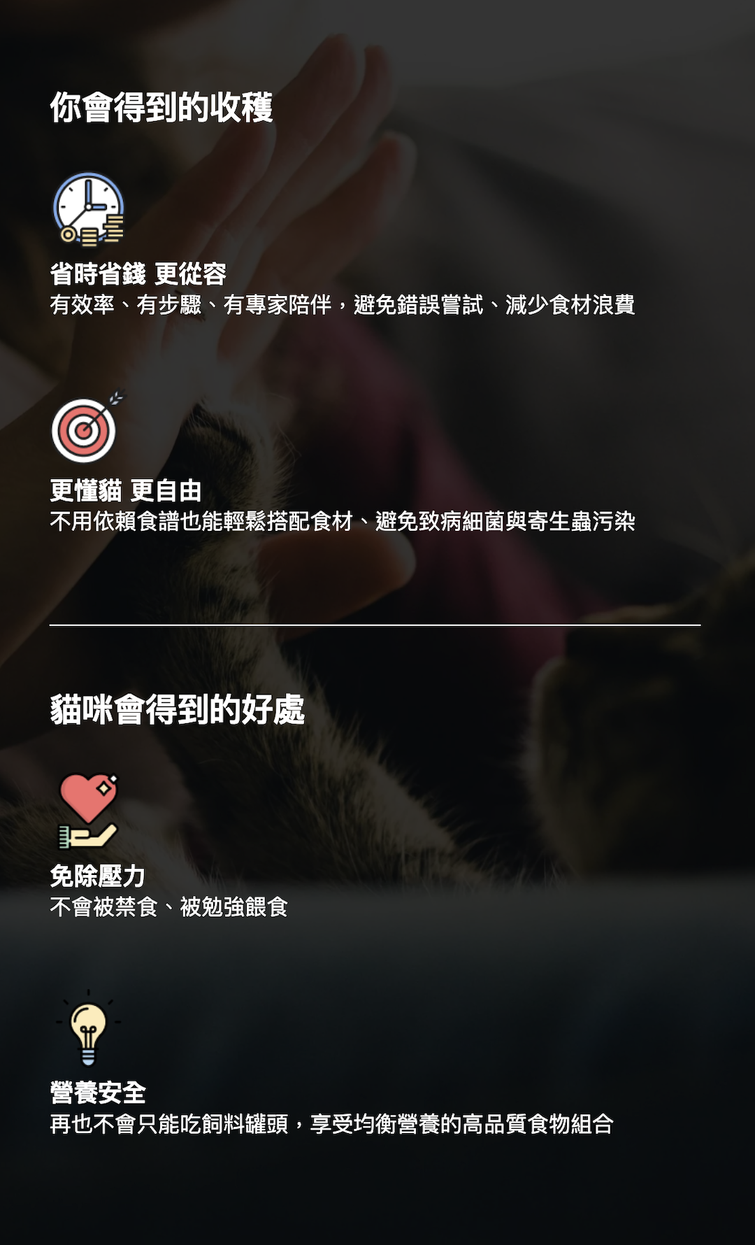 📍諮詢後三週文字陪跑:一起觀察貓咪的變化,陪伴你更安心無懼、更精準的執行自製貓生食計畫!確保貓咪「安全飲食」。